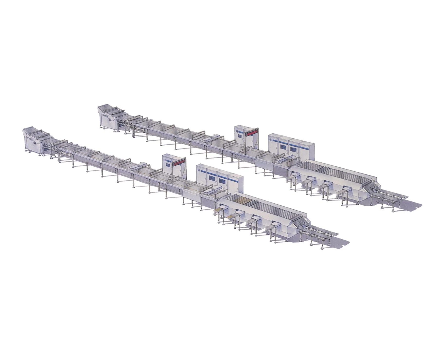 A combination of conveyor infeed equipment, vibratory tracks and a Vee Belt accumulation system feeds product to individual row strip-off units. From here, product transfers to a row depositor, which is at 90 degrees to the slug collators and finally 4 roll wrappers on each leg of the system.